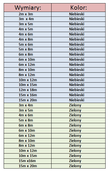 Dostępne rozmiary plandek:
